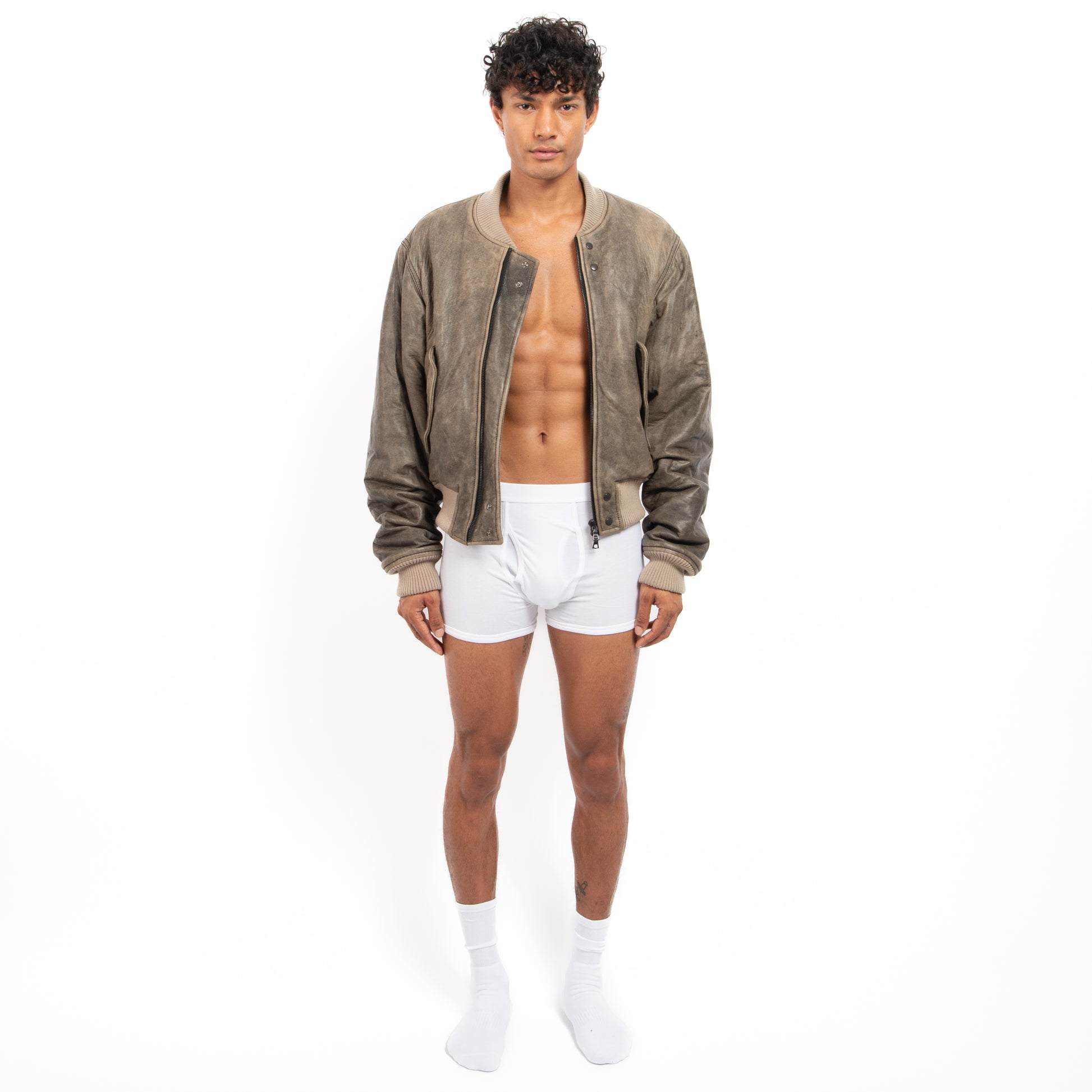 Made with a grey distressed Italian Nappa leather — complete with a zipper front closure and press stud front pockets. It features a ribbed collar, cuffs, hem and has an internal pocket. The jacket will naturally age over time, finishing the design process.